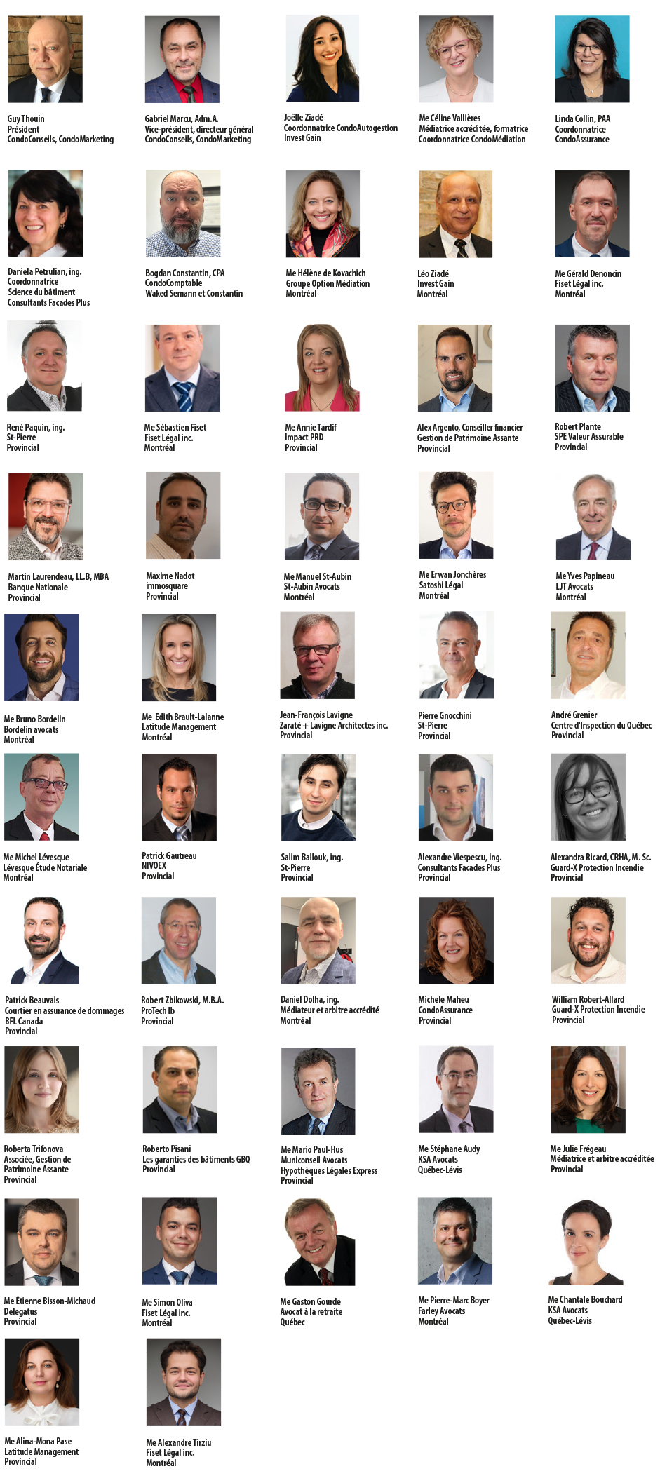 - Accès à de l'assistance téléphonique auprès d'avocats, notaires, médiateurs et arbitres chevronnés en copropriété;