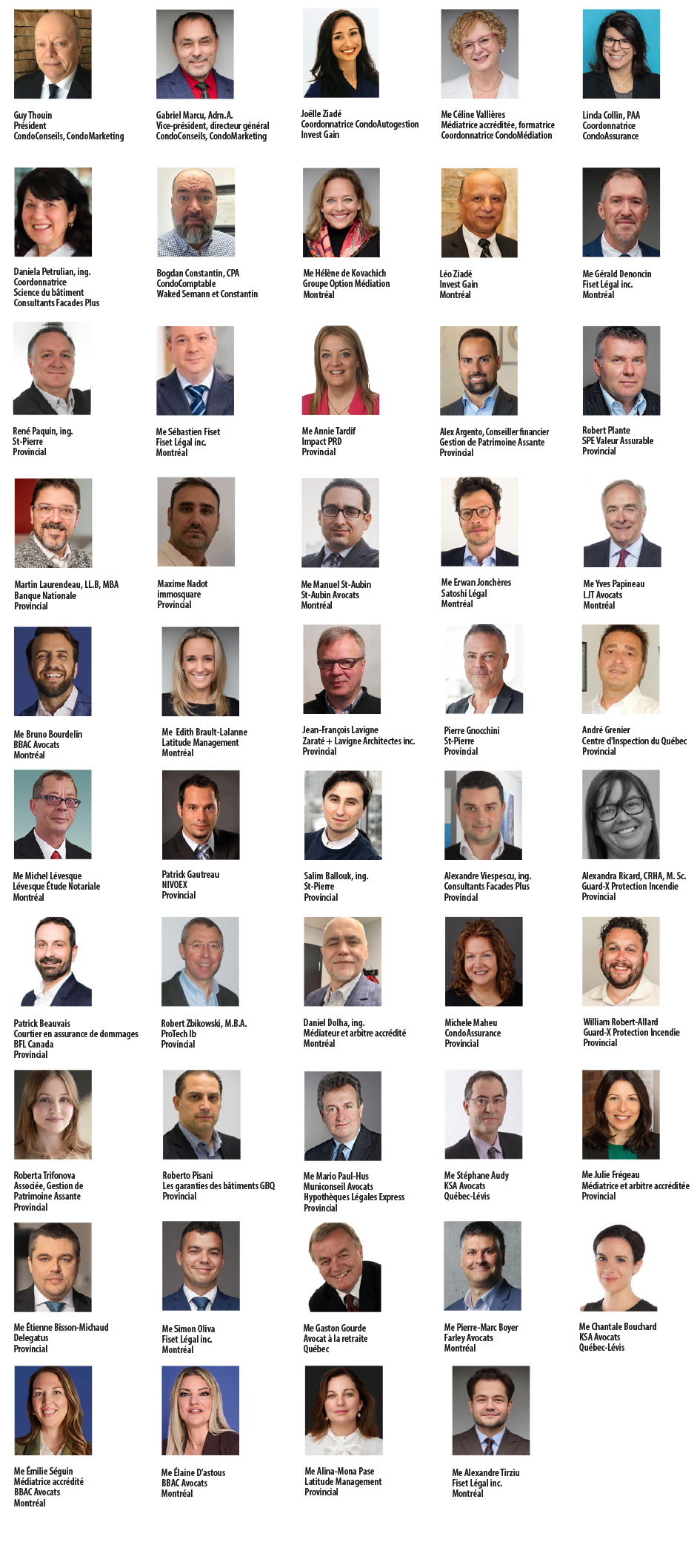 Conférenciers: M. Gabriel Marcu, Adm.A., Médiateur accrédité (IMAQ), vice-président, directeur général, CondoConseils / CondoMarketing; Mme Linda Collin, PAA, Experte en sinistre, coordonnatrice à CondoAssurance; Mme Annie Tardif, LL.M., Avocate, médiatrice familiale et médiatrice civile accréditée, Coordonnatrice académique, Prévention et règlement des différends, UdeS (Longueuil). Programmes de prévention et règlement des différends (PRD) de la Faculté de droit de l'Université de Sherbrooke et Mme Joëlle Ziadé, Invest Gain.